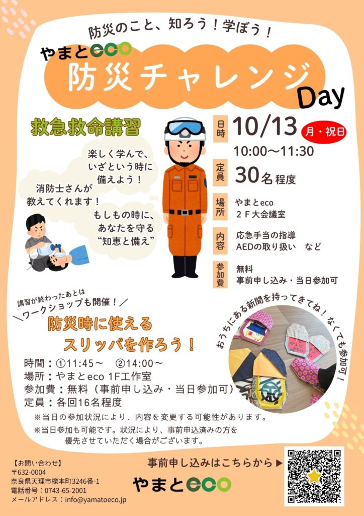 2025年10月13日(月・祝) 防災イベント:10:00~11:30、ワークショップ:①11:45~,②14:00~